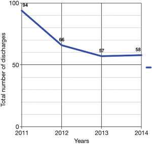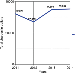 From 2011 to 2014, the number of inpatient admissions with a principal diagnosis of PCS totally 275. From 2011 to 2012, there was a 38.3% decrease, from 94 to 58 diagnoses respectively (Figure 1). The length of hospital stay was 4.28±4.28, 3.42±2.73, 3.74±1.84, and 3.79±2.78 days in 2011, 2012, 2013, and 2014, respectively (Figure 2). The total yearly charges were $32,079±$24,697, $27,019±$22,633, $34,898.21±$24,408, and $35,204±$32,951 in 2011, 2012, 2013, and 2014, respectively (Figure 3). There was a significant decrease in the average length of hospital stay between 2011 and 2012, from 4.28 to 3.42 days (P=0.07), respectively. Then hospital stay started to increase again to 3.74 and 3.79 days, in 2013 and 2014, respectively. Concordantly with the decrease in average length of stay, the mean hospital charges for PCS related hospitalizations per patient decreased 18.2%, from 33,017 in 2011 (adjusted for inflation), to $27,019 in 2012 (P=0.18). There was an increase of 27.1% in hospital cost between 2012 to 2013, from 27,449 (adjusted for inflation) to 34,898 (P=0.05), then hospital cost remained almost stable between 2013 and 2014, after adjustment for inflation occurred, from $35,449 to $36,204.