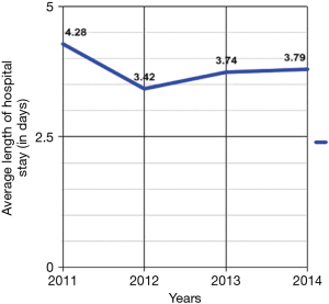 Placed within the larger context of the overall cost of a cholecystectomy procedure, the individual healthcare burden PCS poses is indeed costly. Given that quality of care is not being compromised on any level—as only symptoms are being managed in most cases—clear opportunity exists for improved resource utilization. According to the ‘healthcare value’ definition—in which outcome is measured for each dollar spent—only beneficial outcomes are worthwhile (13). In our study, during the years of 2011, 2012, 2013, and 2014, the average length of hospital stay was 4.28, 3.42, 3.74, and 3.79 days, respectively. Hence our data represents a clear association between length of hospital stay and financial burden.