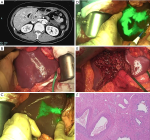 Figure 1 Anatomical S5 segmentectomy. (A) Abdominal CT showing atrophic region in S5. (B) Naked-eye visualization of atrophic region. (C) Near infrared fluorescence imaging showing altered biliary drainage after preoperative ICG administration. (D) Segment 5 demarcation after positive staining with ICG and indigo-carmine. (E) State of the liver after S5 segmentectomy. (F) Anatomopathological findings of sclerosing cholangitis. Hematoxylin & eosin, ×40. CT, computed tomography; ICG, indocyanine green. - Under Pringle maneuver, hepatic parenchyma was transected using the clamp-crash technique. During the procedure, the two major portal branches previously stained were identified and ligated. Tributaries of the right hepatic vein and the middle hepatic vein were also divided.