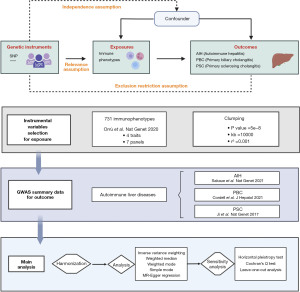 Mendelian randomization (MR) is a statistical tool that boldly investigates whether a specific factor has a causal impact on a particular health outcome, like disease risk (7). This method harnesses genetic variants as instrumental variables (IVs), capitalizing on the fact that genetic variants are biologically linked to certain factors but remain unaffected by environmental influences. Consequently, MR has the capacity to mimic the effect of a randomized trial on disease risk without being confounded by extraneous factors (8). In recent years, GWAS advancements have provided researchers with extensive genetic variation data, enhancing the comprehensiveness and precision of MR studies. Our investigation aims to shed light on the causal relationship between immune cell characteristics and AILDs through a thorough MR analysis. We present this article in accordance with the STROBE-MR reporting checklist (available at https://tgh.amegroups.com/article/view/10.21037/tgh-25-2/rc).