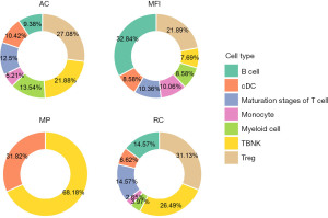 After conducting significance and LD screening of SNPs on 731 immune cell phenotypes, a total of 2,803 influential SNPs were filtered, involving 607 immune cell phenotypes. These phenotypes were categorized based on their typical characteristics and cell types, yielding proportions for each cell category (Figure 2). Notably, the MP category encompasses a relatively minor array of cell types, comprising solely conventional dendritic cells (cDCs) as well as T, B and natural killer (TBNK) cells, while the remaining feature classifications encompass seven distinct cell categories. Remarkably, all IVs boasted F-statistics surpassing 10, underscoring the robustness of their selection.