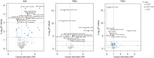 In the current investigation, IVs culled from exposure data underwent MR scrutiny against outcome data about AIH, PBC and PSC. In general, the standard error of the IVW method tends to be lower than that of other methods. As a result, in cases where heterogeneity and horizontal pleiotropy are absent, priority will be given to utilizing the results obtained from the IVW analysis, which is considered the gold standard of MR analysis. Therefore, we first screened the results of IVW analysis based on a P value of 0.05, obtaining 40, 24, and 61 SNPs in AIH, PBC, and PSC. To enhance significance, we further narrowed the threshold to 0.001, reducing the significant SNPs in AIH, PBC, and PSC to 15, 16, and 9. We presented these preliminary screening results in Figure 3 in the form of three volcano plots, with results generated by different thresholds displayed in different colors, and also provided an initial description of the positive or negative orientations of each SNP with OR (Figure 3).