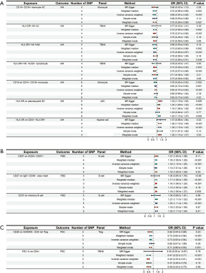 The P values obtained from the level of pleiotropy and heterogeneity analyses in each group are illustrated in Table 1. Although the P values for pleiotropy and heterogeneity of CD28− CD8br AC of Treg cell in the AIH group meet the screening criteria, the 95% CI in its MR Egger method ranges from 0.002 to 1,846, indicating an extreme outlier. To ensure data reliability, this analysis opts to exclude this SNP. Additionally, as depicted in Table 1, in the PSC group, some SNPs fail to meet the requirements of the pleiotropy analysis’s Cochran’s Q value, where P value is less than 0.05, namely: HLA-DR on CD14− CD16− monocyte, HLA-DR on monocyte, HLA-DR on CD33− HLA-DR+ myeloid cell. Therefore, according to the screening rules, the results from MR Egger and IVW methods cannot be explained due to the level of pleiotropy, violating the assumptions of MR. Consequently, these three SNPs were excluded from the results. As depicted in Table 1, the MR-PRESSO global test revealed no evidence of horizontal pleiotropy effects, with all P values greater than 0.05, for all exposures except for three exposures (CD27 on CD24+ CD27+ B cell, CD28 on CD45RA− CD4 not Treg cell, FSC-A on CD4+ TBNK cell) where testing was not feasible due to insufficient SNPs (less than 4 SNPs).
