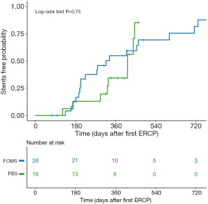 The treatment characteristics of FCMS + PBS and PBS were evaluated among type II patients (Table 2). The results indicated no significant differences between the two treatment groups in terms of operation time, stent duration or stent-free rate; however, the FCMS + PBS group had fewer stents implanted among patients who achieved stent-free success (P=0.02). In addition, although the cost per stent placement session with FCMS + PBS (29,853.4±5,303.8 CNY) was greater than that with multi-PBS (18,339.2±3,503.3 CNY, P<0.001), the lower number of treatment sessions made the total cost of FCMS + PBS (67,493.6±25,353.4 CNY) significantly lower than that of multi-PBS (89,012.8±14,039.2 CNY, P=0.04). For type I patients, Kaplan-Meier curves showed that the stent-free survival rate did not significantly differ between the FCMS and PBS groups (P=0.75) (Figure 4). Comparisons of the treatment characteristics revealed no significant differences terms of the stent-free rate, duration of stent placement, or incidence of complications between the FCMS and PBS groups (Table 3). However, among the patients who achieved stent-free status, the FCMS group underwent an average of 1.7±1.2 treatments, which was significantly lower than that of the PBS group (2.6±1.0, P=0.02). Similar to type II patients, the cost efficiency of FCMS treatment was also significantly lower than that of PBS treatment for type I patients (P=0.04).