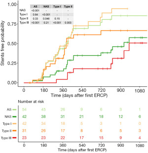 Kaplan-Meier curves were used to analyze the stent-free survival rate in patients who underwent surgery with different classification methods (Figure 5). Ninety-three patients were divided into two groups (green lines) and three groups (red lines) using binary classification and novel classification, respectively. The Kaplan-Meier curves showed no significant difference in the stent-free rate between type I and type II patients (P=0.15). Type I and type II patients had better stent-free rates than type III patients (P<0.001 and P=0.003). According to the binary classification, the stent-free survival rate of the AS group was significantly greater than that of the NAS group (P<0.001). Interestingly, there was no significant difference in stent-free survival between type I patients and AS patients or between type III patients and NAS patients. However, the stent-free rates of type II patients were not significantly different from those of AS patients but were significantly greater than those of NAS patients (P=0.046).