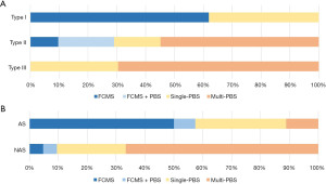 When BS was first diagnosed, 54 (56.3%) patients presented with AS, whereas 42 (43.7%) patients presented with NAS. After radiological re-evaluation, among the 96 patients, 42 (43.8%) were type I, 31 (32.3%) were type II, and 23 (24.0%) were type III. Stent treatment schemes used for the first successful endoscopic treatment were described based on these new classification methods (Figure 2A). Type I patients received FCMS treatment (61.9%) or single-PBS treatment (38.1%). Type III patients received only PBS, including single-PBS (30.4%) or multi-PBS (69.6%). However, patients with type II underwent a variety of treatment options, including multi-PBS (54.8%), FCMS + PBS (19.4%), single-PBS (16.1%) and FCMS (9.7%). To demonstrate the guiding significance of this new classification for treatment options, the stent treatment scheme used in the binary classification system was also described (Figure 2B). For patients with AS, FCMS (50.0%) and single-PBS (31.5%) were the main treatment options. In addition, 11.1% received multi-PBS, and 7.4% received FCMS + PBS. For patients with NAS, multi-PBS (66.7%) and single-PBS (23.8%) were the main treatment options, with 4.8% receiving FCMS and 4.8% receiving FCMS + PBS. Compared to the binary classification system, stent treatments in the new classification were more fixed, especially for type I and type III patients. Endoscopic images of the unique FCMS + PBS implantation scheme and the PBS implantation scheme used for type II patients are shown in Figure 3.