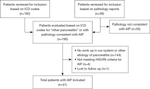 A list of patients with ICD-9 code (577.1) and/or ICD-10 code (K86.1) for ‘Other chronic pancreatitis’ with or without concomitant immunosuppressive medication use was generated using the electronic medical record system. In addition, our institution’s pathology database was queried for all surgical pathology and or cytology specimens obtained from the pancreas, which were then reviewed to identify patients with pancreatic histology findings consistent with AIP (lymphoplasmacytic sclerosing pancreatitis, periductal lymphoplasmacytic infiltrate, obliterative phlebitis, or storiform fibrosis). Patients identified using these two approaches were then manually reviewed to confirm AIP diagnosis based on the HISORt criteria. Only patients with type 1 AIP were included. Finally, using the previously referenced pathology database, patients with confirmed PDAC were randomly selected as controls using a computerized algorithm.