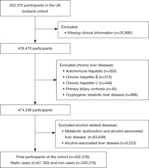 Initially, all participants (n=502,370) were considered. Exclusions were made for participants lacking clinical information (n=25,895). Participants with other chronic liver diseases such as autoimmune hepatitis (K754 for ICD-10 code, n=353), chronic hepatitis B (B181 for ICD-10 code, n=315), chronic hepatitis C (B182 for ICD-10 code, n=448), primary biliary cirrhosis (K753 for ICD-10 code, n=45), and cryptogenic steatotic liver disease (SLD) (n=966) were also excluded to specifically focus on MASLD. Cryptogenic SLD was defined as hepatic steatosis in individuals who did not meet criteria for MASLD, alcohol-related liver disease (ARLD), or metabolic dysfunction and alcohol-associated liver disease (MetALD), based on the absence of both metabolic risk factors and significant alcohol use or relevant ICD-10 codes. To exclude ARLD, we applied both clinical alcohol consumption thresholds (≥350 g/week for females, ≥420 g/week for males) and relevant ICD-10 codes (K700, K701, K702, K703, K704, and K709). MetALD was defined as steatosis in individuals with both metabolic dysfunction and moderate alcohol intake not meeting ARLD criteria (20). Specifically, participants with ARLD, including MetALD (n=63,649) and solely alcohol-associated liver disease (n=8,223), were excluded. After these exclusions, the final study cohort included 402,476 participants, of which 67,160 were identified as statin users and 335,316 as non-users (Figure 1).