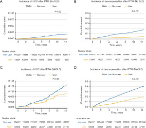 However, statin users demonstrated a significantly lower incidence of hepatic decompensation and ascites across the entire cohort. The HR for hepatic decompensation was 0.41, and more specifically for ascites, it was 0.35, suggesting that statin usage diminishes the risk of severe hepatic complications in the overall population (Figures S4,S6B,S7 and Tables S6,S7). In the no SLD cohort, statin users also experienced a notable decrease in the incidence of hepatic decompensation and ascites compared to non-users (Figure 3, Figures S6B,S7 and Tables S6,S7). In the MASLD cohort, Kaplan-Meier curves and hazard analysis confirmed that statin users manifested a significantly lower incidence of hepatic decompensation and ascites compared to non-users (Figure 3D, Figures S6B,S7 and Tables S6,S7).