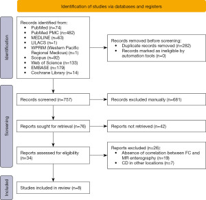 The objective of this study was to perform a systematic review (SR) exploring the correlation between FC levels and MR enterography findings in patients with ileal CD, as the association between these two diagnostic approaches remains unclear. We present this article in accordance with the PRISMA reporting checklist (available at https://tgh.amegroups.com/article/view/10.21037/tgh-24-159/rc).