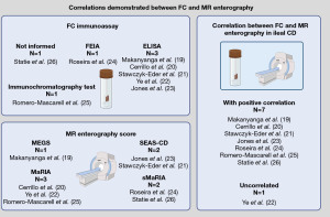 | Outcomes | Studies demonstrating correlations between the measurement of FC levels and MR enterography findings |